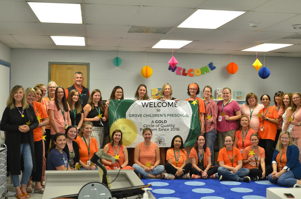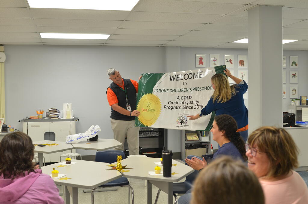 District 58 honored some special staff members with a surprise party. The Grove Children’s preschool staff were instrumental in earning a Gold Rating from the Illinois State Board of Education – the highest honor that a preschool can receive. “I know how very difficult it is to earn this and I thank the staff for the hard work, passion and commitment they show every single day,” said Superintendent Dr. Kevin Russell.